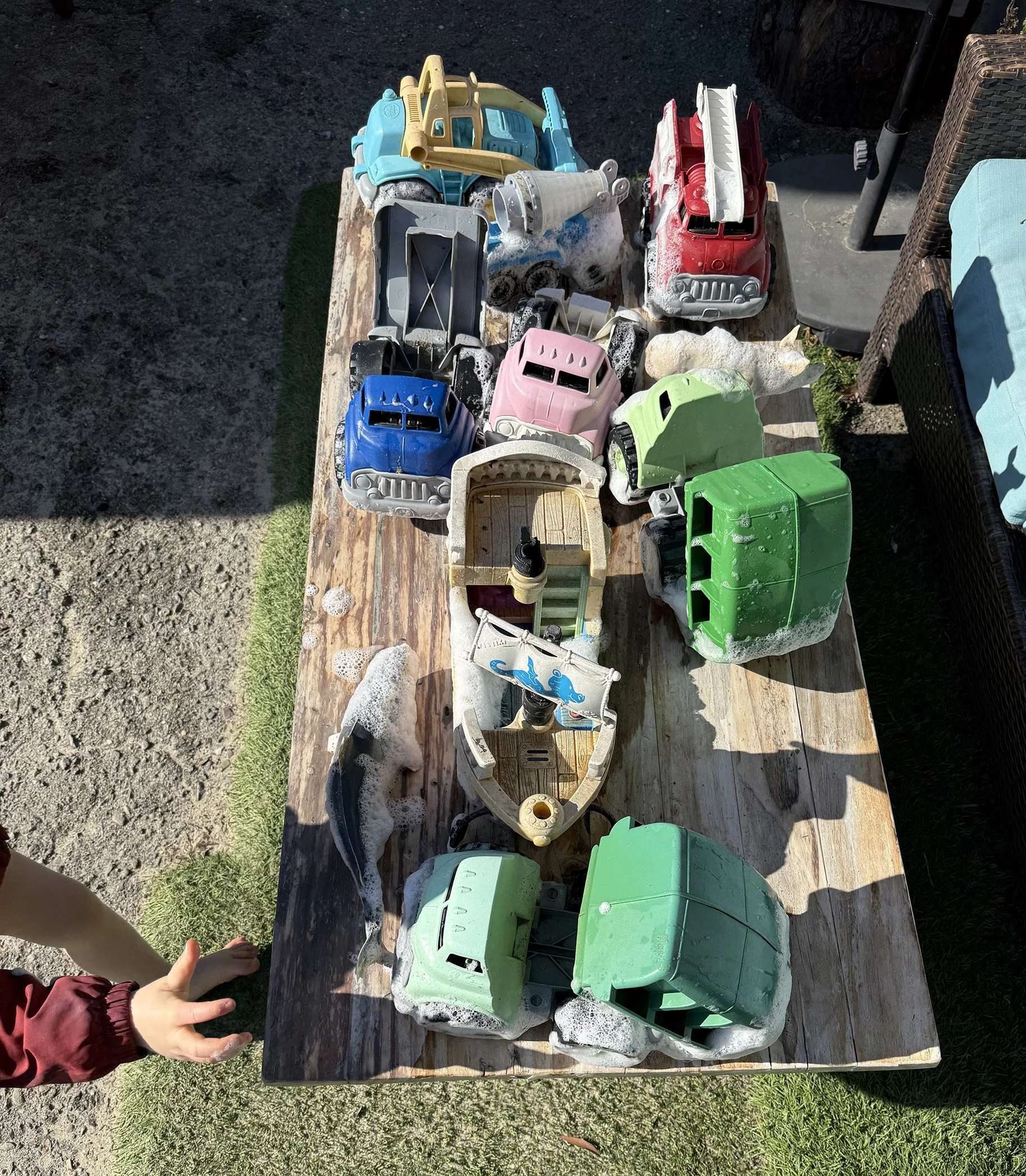 This week, I had the opportunity to observe a car wash get started in the preschool area, with sand being poured over vehicles, then brushed aside along the sandbox step. Based on this observation of play, and wanting to support them to play bigger, I decided to help expand their car wash: I opened up the blue sensory bin, got dish soap from the office, and made some bubbles. One student called it the “bubble trouble bathtub.”